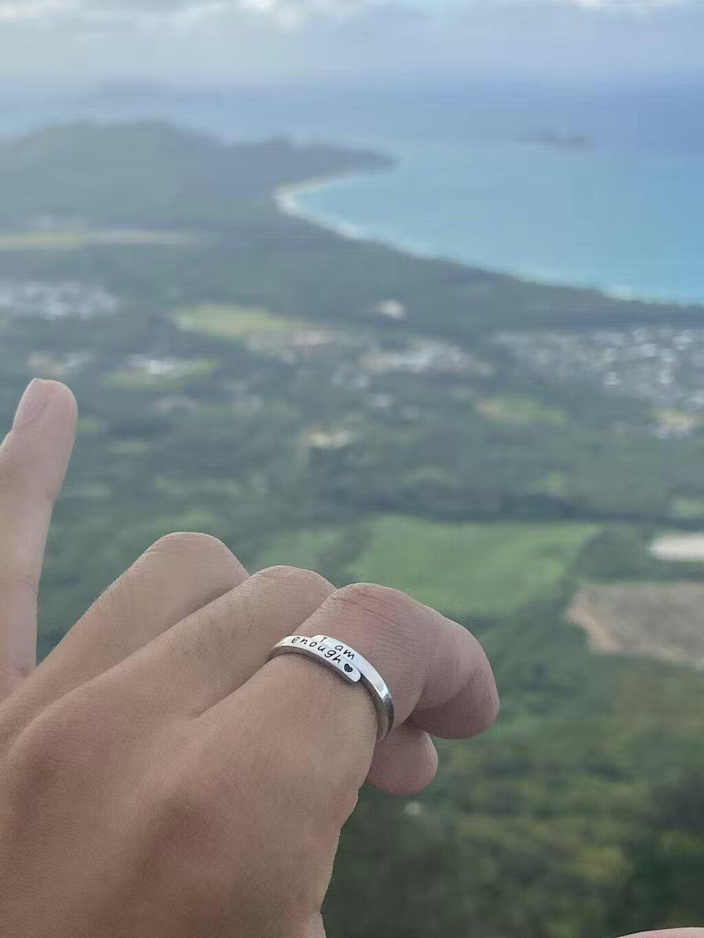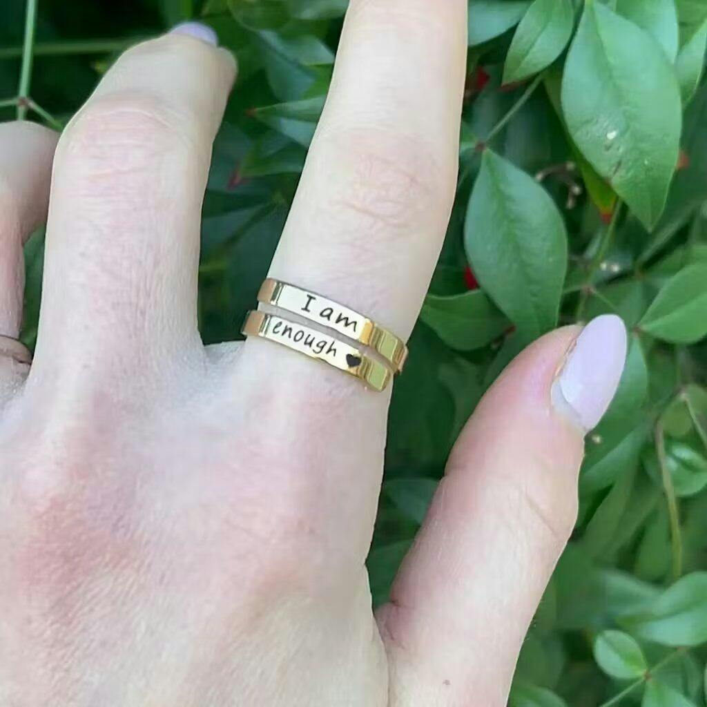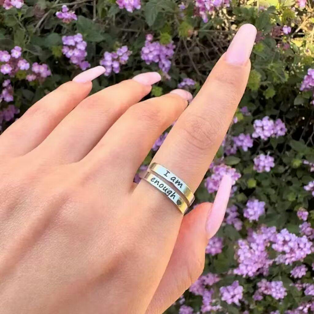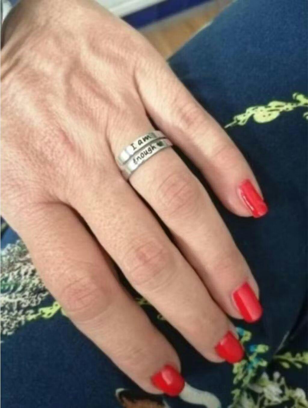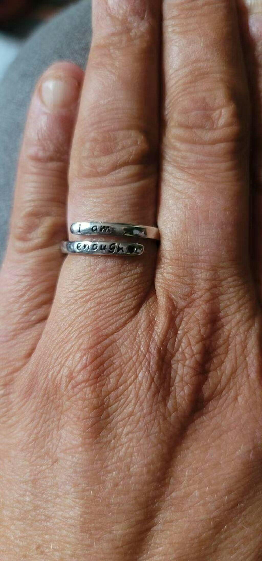 "First off, this ring is very important to me because I deal with pretty intense mental health issues, and this is a reminder that I am enough regardless of my extras. It is a constant reminder and brings a wave of calm and recentering. As for the actual ring, it is very comfortable. Some adjustable rings, when you open them to fit, stretch oblong, and this ring stays in shape, so no part of my finger is squished. It is also smooth, so it does not irritate my finger at all. I believe it will be a ring that I wear for years. ❤️" - Pam H. ⭐️⭐️⭐️⭐️⭐️